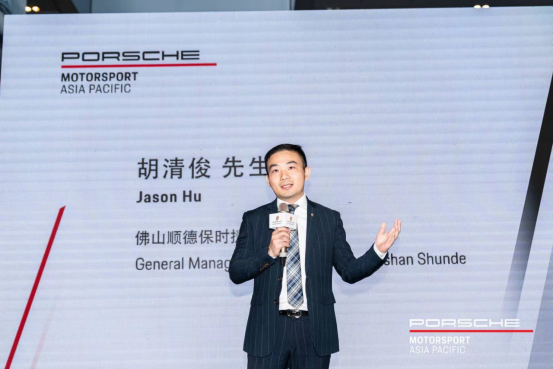 在介绍赛事计划之后,保时捷亚太赛车运动董事总经理 Alexandre Gibot 季博安先生与佛山顺德保时捷中心总经理 Jason Hu胡清俊先生、Meidong Racing车队经理高磊美东车队车手Alexandre Imperatori 共同揭开了保时捷911 GT3 R赛车的面纱。