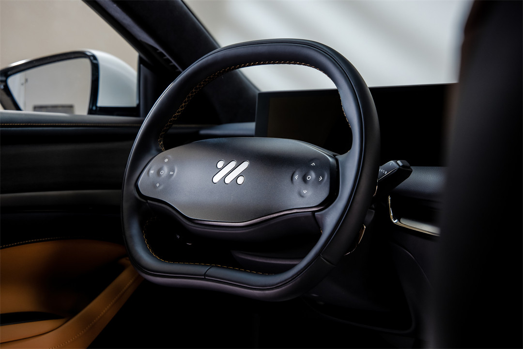 方向盘的样式也摆脱了传统,使用平底两幅式的造型,比较有意思的是,方向盘后方还配有“拨片”,但实际上此拨片并不是用于换挡,而是用于调节辅助驾驶跟随的车距。