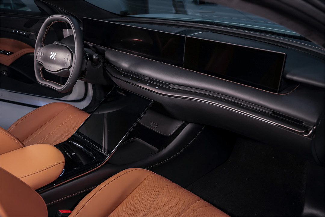 此次亮相除了外观展现以外,车舱内饰也是首次公布的重头戏。进入车内最为亮眼就是一整块的贯穿中控屏幕,其尺寸就达到了39英寸,分辨率也达4K显示,可实现三屏互联。而位于中控下方的AMOLED中枢屏尺寸也达到了12.8英寸,基本替代了整车所有的物理按键,让整个内饰充满简洁、科技氛围感。