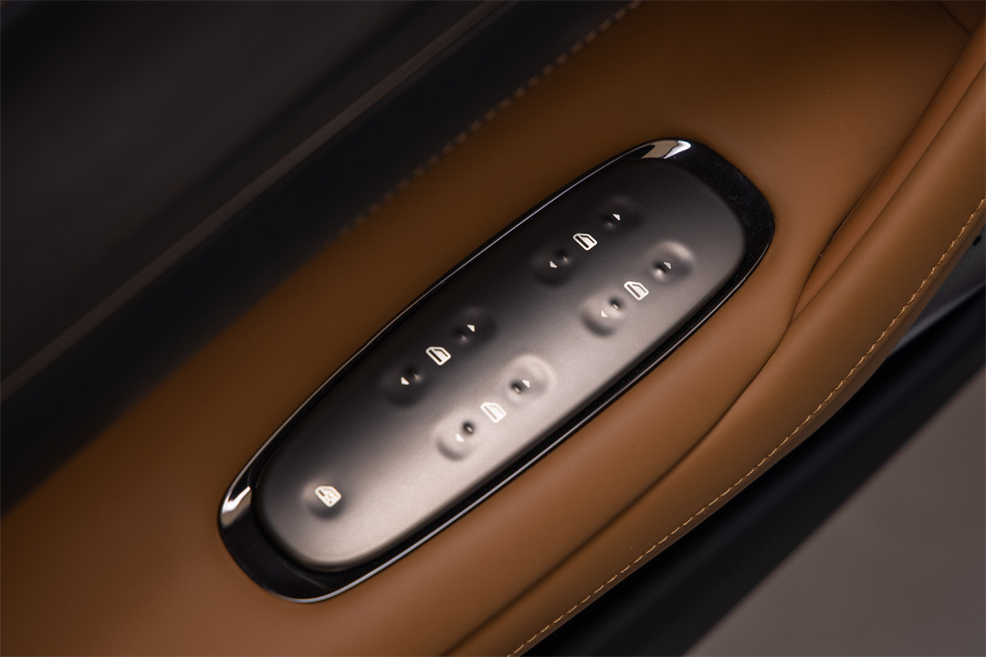 有趣的是,车门板上的车窗调节按键也均采用了触控式,其造型也是相当的独特,不过比较可惜的是,由于车辆无法通电,所以显示不出带有背光的效果。