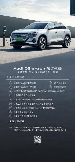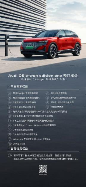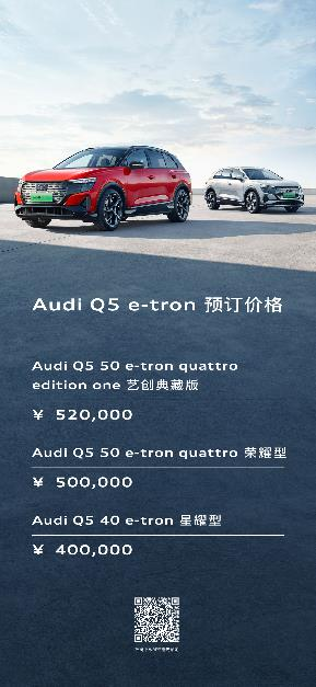 奥迪Q5 40 e-tron星耀型预订价格为40万元,奥迪Q5 50 e-tron quattro荣耀型预订价格为50万元,囊括“整车与三电质保”、“黑金会员助理”、“30天超长试驾”、“3年不限量免费公桩充电”、“送装奥迪充电墙盒”等12重尊享权益。特别打造的奥迪Q5 50 e-tron quattro艺创典藏版也同步亮相,预订价格为52万元,以“edition one”标识和限定配置,以及额外的专属限定号数字藏品、艺术家共创数字藏品车型的同款贴纸、奥迪Roadjet专属电动滑板车、代客充电服务,以及3年200张通兑卡券,赋予消费者尊贵的专属体验。同时,上汽奥迪推行360°充电服务,以全方位的生态体系,为用户提供便捷无忧的充电服务解决方案。