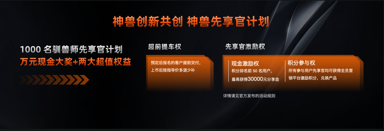 而为了让用户能够先期体验神兽,广州车展当天,哈弗品牌开启1000名驯兽师先享官计划。凡是在预售期下订的驯兽师们,均可在预售期内抢先获得优先提车特权。此外,品牌还宣布了先享激励计划,即所有参与先享计划的用户通过完成任务获得积分,最高可获得30000元的分享基金激励。