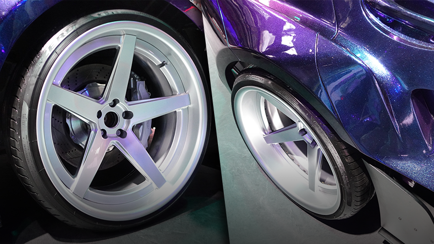 下半部分则安装了一款硕大的后扰流板,并且后轮同样也改上了宽体,从正后方看上去,它的整个车尾显得十分的宽大,颇有几分赛车的味道。