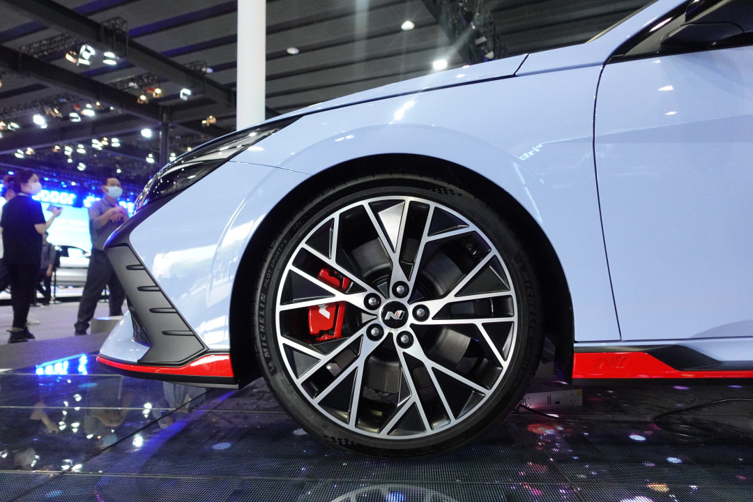 车身侧面,整体轮廓与普通伊兰特保持一致,依然是比较优雅时尚的人Z型腰线以及年轻人喜欢的溜背式车身造型。不同之处在于这款19英寸运动多幅式轮毂,让整车显得更为低趴运动,不仅仅是好看,其所配备的轮胎为米其林PS4S,能有效提升干湿地抓地力和刹车性能,带来更出色的高速稳定过弯性能。此外,该车还配备了红色涂装刹车卡钳以及红色侧裙,进一步彰显新车的战斗感。
