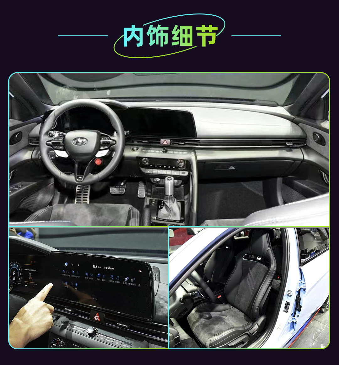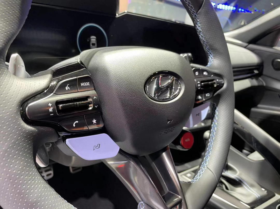 内饰方面,延续了普通版伊兰特简洁时尚的设计风格,双10.25英寸大屏也紧贴时下科技的内饰设计主流,偏向驾驶员一侧的中控台也体现了人性化的设计。当然新车在细节上和用料上还是有很大区别,其配备了一体式运动座椅,并采用Alcantara以及皮质材料。