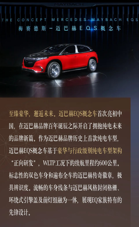 至臻豪华,邂逅未来。继9月慕尼黑IAA车展全球首发后,迈巴赫EQS概念车首次亮相中国,在迈巴赫品牌百年诞辰之际开启了拥抱纯电未来的品牌新篇。作为迈巴赫品牌历史上首款纯电车型,迈巴赫EQS 概念车基于豪华与行政级别纯电车型架构“正向研发”,WLTP工况下的续航里程约600公里。标志性的双色车身和遍布全车的迈巴赫传奇徽章,极具辨识度。流畅的车身线条与迈巴赫风格封闭格栅、环绕式引擎盖及前灯组融为一体,展现EQ家族特有的先锋设计。内饰则以白色座椅、白色钢琴烤漆工艺的木饰条搭配深蓝色门板装饰,并点缀大量玫瑰金色饰件,诠释匠心工艺。源自迈巴赫S级轿车的前后排尊享行政座椅,造就宽适臻享的专属空间;而带迈巴赫专属显示风格与内容的MBUX超联屏,则完美适应客户对数字化的多元需求。