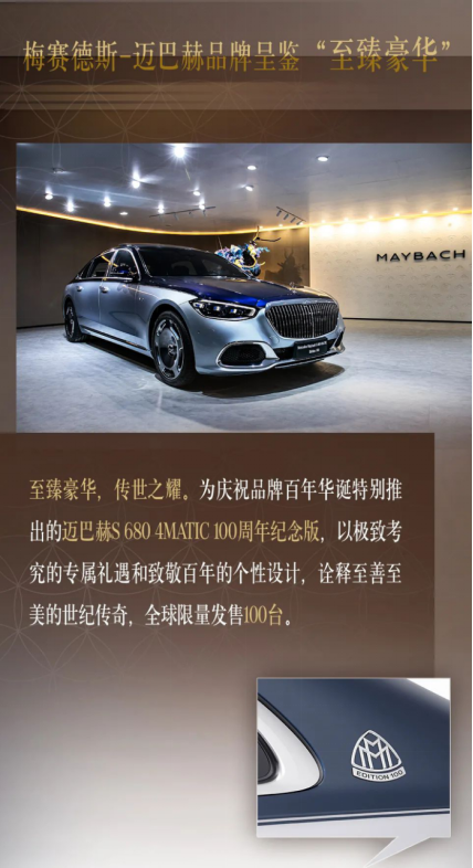 至臻豪华,传世之耀。为庆祝品牌百年华诞特别推出的迈巴赫S 680 4MATIC 100周年纪念版,以极致考究的专属礼遇和致敬百年的个性设计,诠释至善至美的世纪传奇,全球限量发售100台。外观采用迈巴赫家族标志性的竖直格栅,搭配手工喷涂的时空银/海岳蓝“双色”车漆,彰显现代时尚的艺术格调。专属“EDITION 100”标识精心装饰于车身侧面、内饰面板和全新轮毂等处,进一步强化专属身份。车内臻选低调深邃的黑色真皮内饰,并配备Burmester®高端4D环绕立体声音响系统、头等舱级后排独立座椅,以及先进的后排信息娱乐系统,营造尊崇备至的驾乘感受。