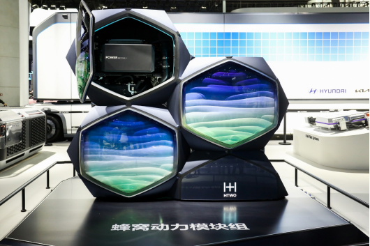 现代汽车始终认为,氢能始于车但不止于车,其作为高能量密度的绿色清洁能源,将在未来以电力为主要驱动力的社会中发挥极为重要的作用,尤其是在发电以及电力保障领域将做出巨大贡献。本次车展上,围绕着氢动智能无人运输车(TRAILER DRONE),现代汽车集中展示了多种类型、不同用途的氢燃料电池系统。比如,“能量晶体”形状的全新氢燃料电池能量模块系统可通过将100kW单元模块“乐高积木式”堆叠,形成500kW或1MW(兆瓦)级强大功率输出,可作为大型船舶或IT公司等大量耗电企业的应急电源系统,而移动式氢燃料电池发电系统则不仅可以为家用车辆及用电设施供电,还可为拥有极致性能的纯电动赛车提供快速充电。