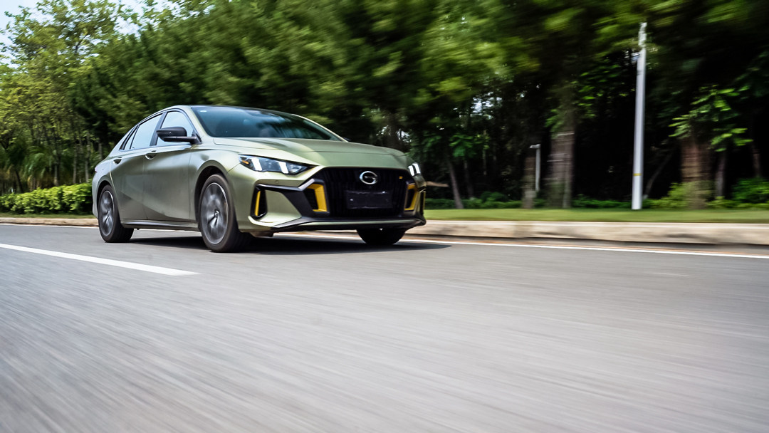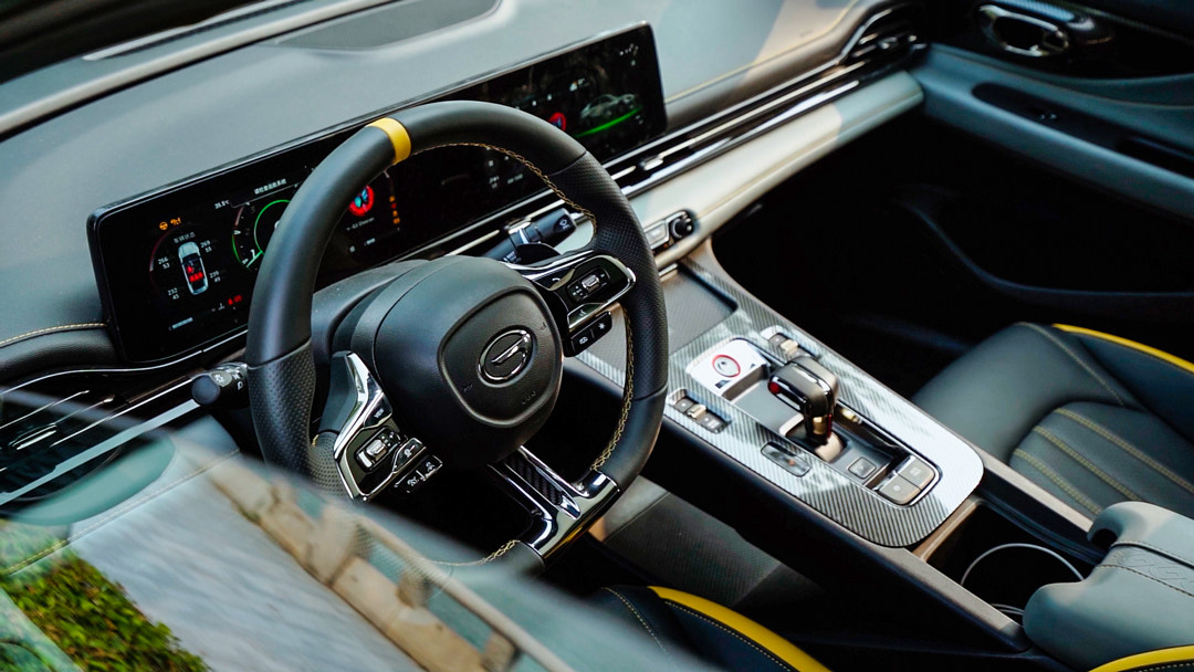 影豹在造型上可以说是相当激进了,一改大家以往对于广汽传祺轿车那种偏向商务的印象。大面积竖状进气格栅、类似战斗机的进气口、碳纤维的装饰板,以及四出排气,满满的战斗感。至于好不好看就因人而异了,有些人会觉得用力过度,但是在我的审美范围内的。