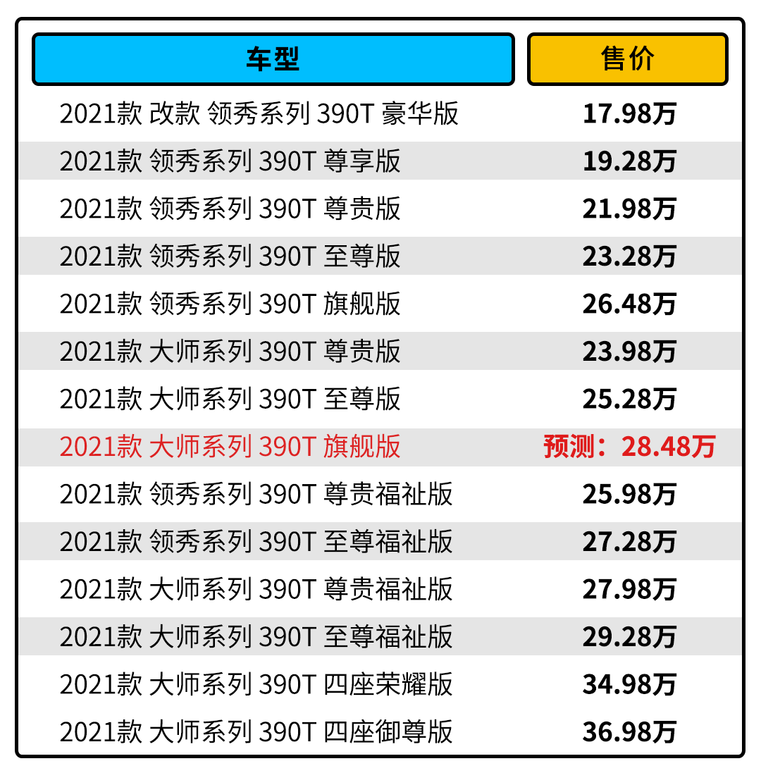 售价方面,目前新车还未公布,不过考虑到新车采用传统的2+2+3七座布局方式,售价肯定不会比四座版车型高。而作为参考,领袖系列的旗舰版车型售价为26.48万元,同配置的情况下,一般的大师系列车型会比领袖系列车型贵两万,因此,买买君预测新车售价为28.48万元,你们觉得如何?