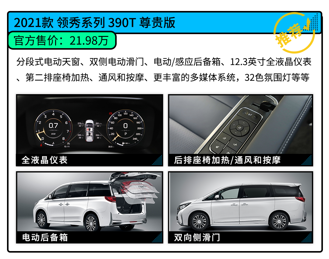 不过对于绝大部分消费者来说,旗舰版车型显然不是最佳选择,尽管配置非常丰富,但相对实用性和售价而言,显得并不是那么物有所值。对于注重于家用的消费者,买买君比较推荐 领秀系列 390T 尊贵版,相比尊享版虽贵了2.7万元,但却多了18英寸轮毂、分段式电动天窗、双侧电动滑门、电动/感应后备箱、12.3英寸全液晶仪表、第二排腿托调节/腰部调节、第二排座椅加热、通风和按摩、更丰富的多媒体系统,32色氛围灯以及自动头灯等诸多实用性配置,性价比非常高。