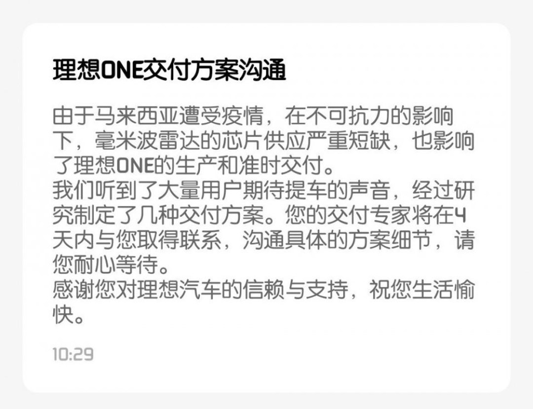 理想汽车是最早面临“缺芯”的厂家,在今年10月初,理想汽车就芯片短缺一事,向理想准车主推送了“沟通方案”,称由于马来西亚遭受疫情,导致毫米波雷达芯片供应短缺,影响了理想ONE的生产和交付。