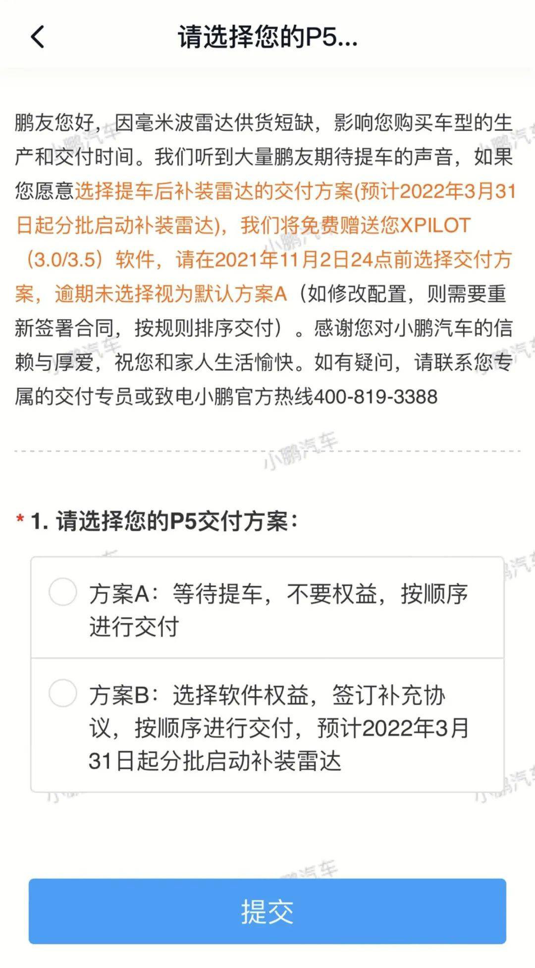 作为国内三大造车新势力之一的小鹏也不能“独善其身”。在10月底,小鹏表示受到毫米波雷达芯片供应不足的影响,旗下P5车型的交付作出两个方案供消费者选择。