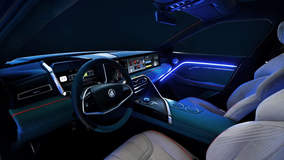 内饰也同样有点赛博朋克的味道,比较可惜的是它竟然不再“机甲”了,反而走的时候智能座舱、豪华、舒适路线。