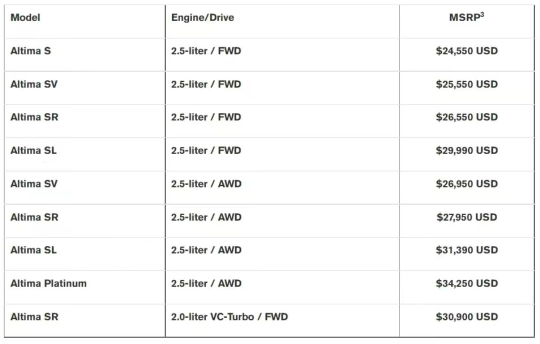 近日,日产在北美正式发布了2022款Altima(对应的国产版车型为天籁),共推出9款车型,售价区间为24550美元-30900美元,约合人民币15.69万-19.75万元。其中还包括一款特别版车型,新车命名为Midnight Edition(午夜版)。该车在海外市场可提供2.5升和2.0T两款动力,其中2.5升车型除前驱版外,还可匹配四驱系统,而2.0T车型仅提供前驱版。
