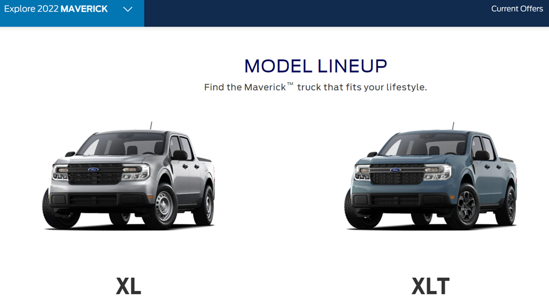 在美国市场,福特Maverick定位于紧凑型皮卡,所以设计风格跟自家的其他皮卡不同。其整体车身造型像是一台缩小版的F-150,就算遮住车标相信也能猜到它是福特的皮卡,只是Maverick在气势上要比F-150弱很多。