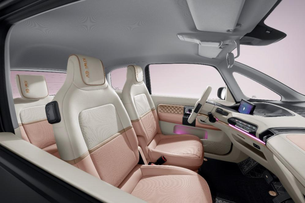 为时髦而生!KiWi EV“时髦金”内饰高定版内饰运用“藕粉+米白”时尚拼色设计,营造出柔和优雅气息;内饰材质采用环保超细纤维皮革,加持Nappa工艺及纯手工包覆工艺,将高级触感和视觉质感尽情展现;同时,在内饰布置上搭配64色智能氛围灯、自定义刺绣铭牌,为用户带来个性定制体验。