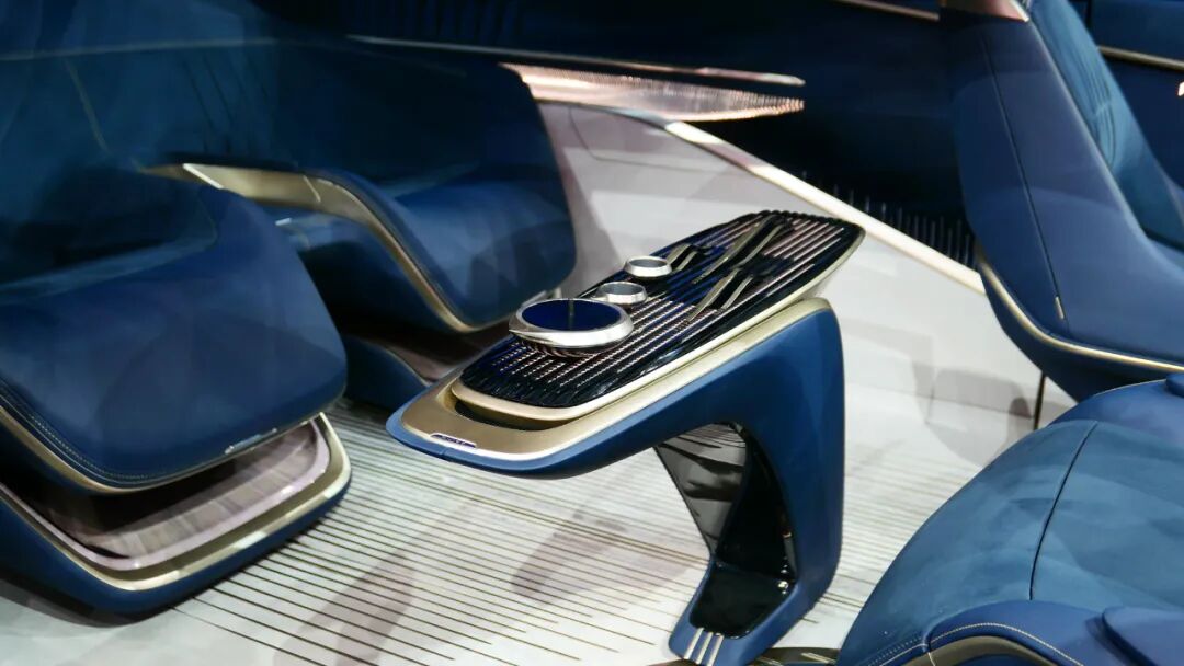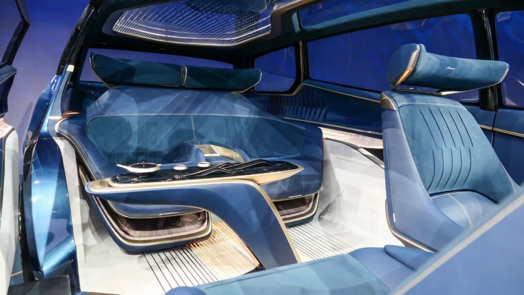 当然作为一台MPV,后排才是重点考核项目,由于概念车是4座版本,所以后排空间相当宽敞。另外还设置了中央山水茶台,茶台上设有连绵起伏的山水装饰,以及茶杯和两个杯子。