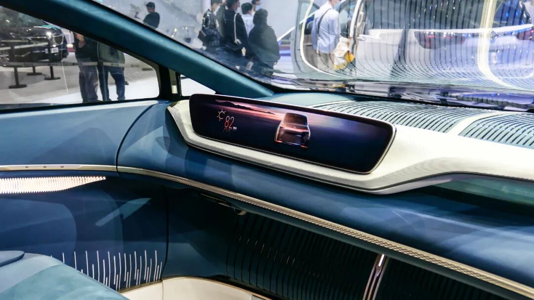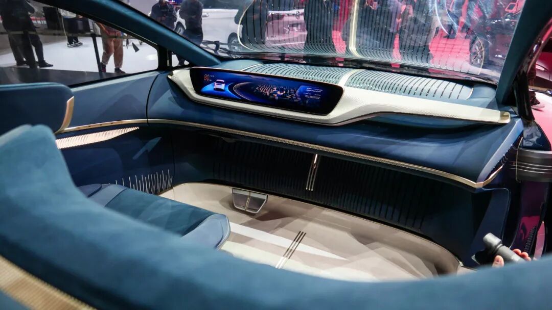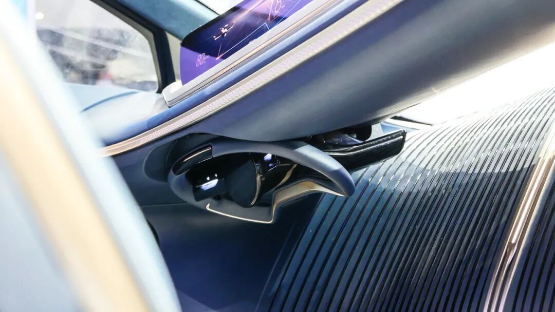 中控台上最大的亮点是这块,以驾驶员为中心的环幕式视网膜屏,但除了这块屏幕,似乎找不到可以操作的按键和方向盘,别急,可隐藏式的方向盘藏在了中控台下方,需要时随时出现在你面前。