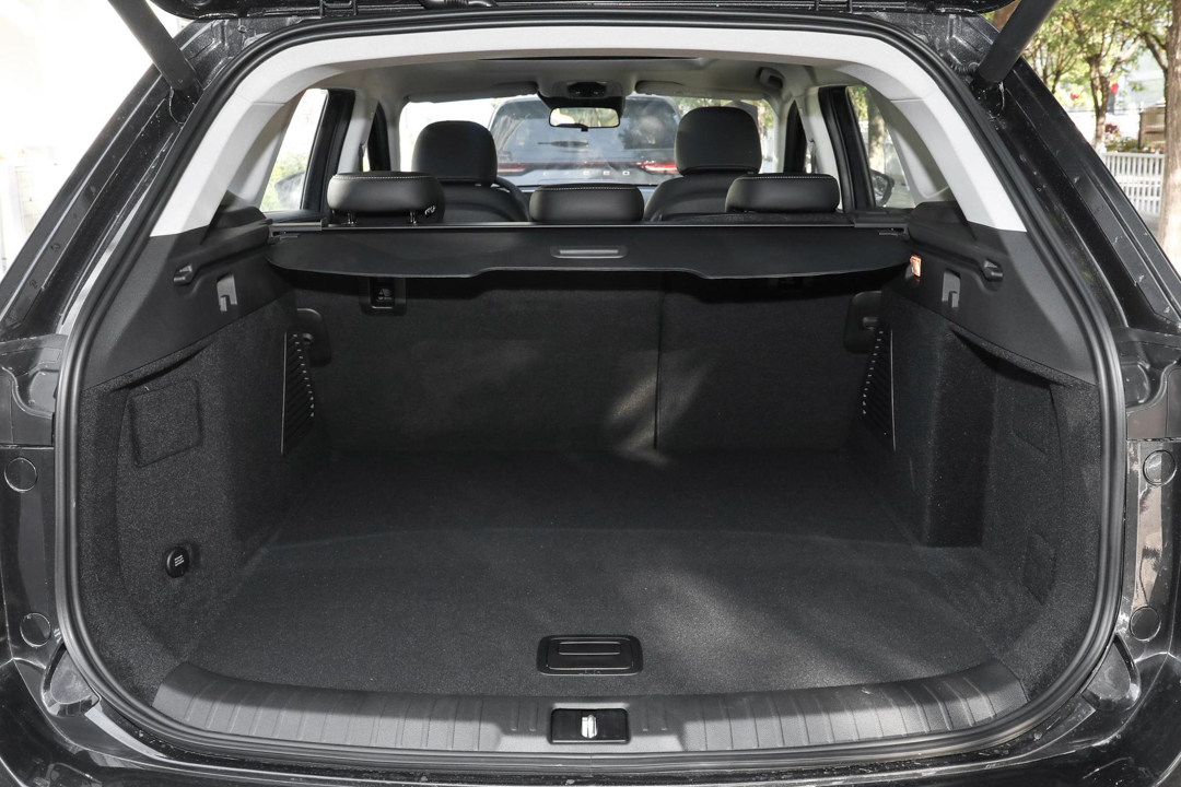 后备厢容积同样讨喜,试驾车不仅配备了电动尾门,而且常规状态下的进深达到了970mm,最窄处的宽度也有1000mm,高度为730mm,实测可以同时放进20、24、28寸三个行李箱,可以说一家五口同时出行是绝对足够的了。