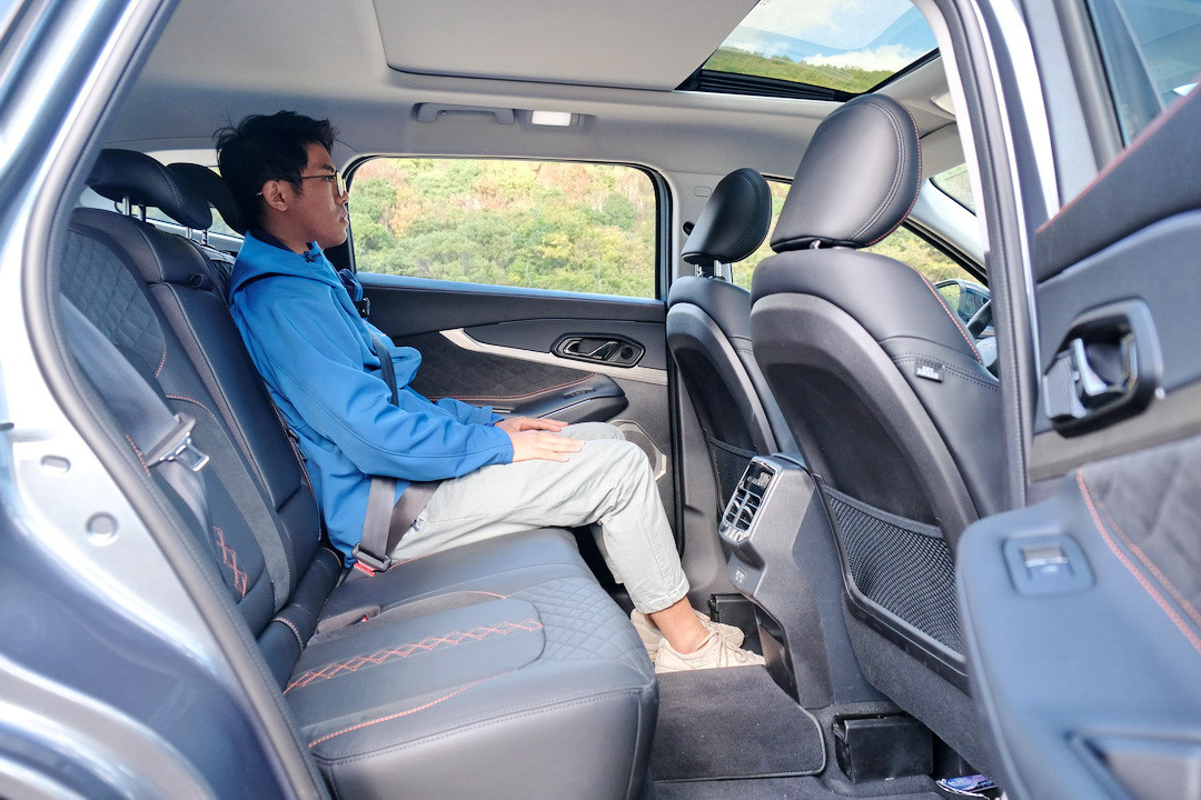 空间表现方面,教授身高为175 cm,前排头部的空间有1拳多一点,后排腿部空间两拳有多,头部空间一拳,乘坐空间属于比较宽敞的水平,哪怕是身高185 cm的成年人也能舒适地乘坐,不过后排地台中间隆起较高,长时间乘坐难免会比较累。