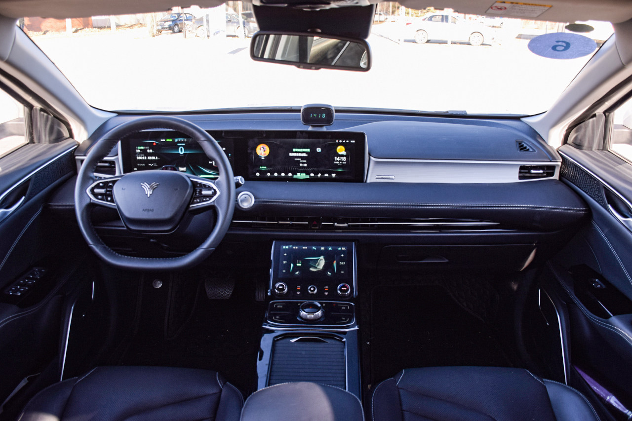 内饰的布局较为常规,元素也简明扼要——联屏、贯穿式中控台、旋钮式电子挡把,构成了它的主视觉。另外,哪吒U Pro有透明A柱这个亮点,但是试驾车辆并未选装,所以这次教授没能体验,略显遗憾。