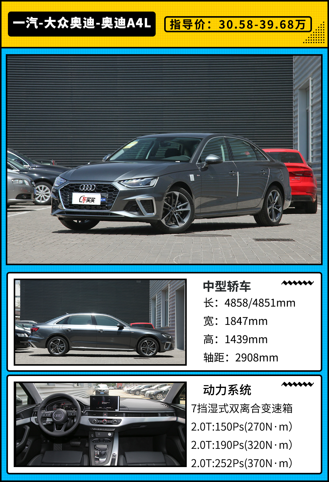 新款奥迪A4L推出7款配置车型,售价区间为30.68-39.68万元,相比老款车型取消了40 TFSI quattro豪华动感型/致雅型、45 TFSI quattro臻选致雅型,新增一款40 TFSI quattro RS套件燃速型。新款奥迪A4L将延续现款车型的造型设计,除了新增的RS 套件燃速型车款,其它不会有很大的改动。从此次改款可以看出,奥迪A4L更清楚自己在市场中的定位,动感型才是真爱。