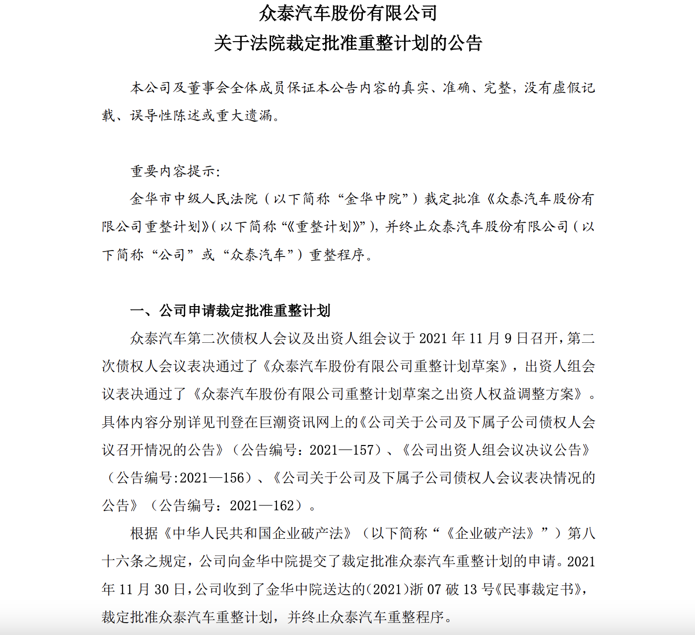 就在12月1日,据*ST众泰公告称,公司向金华中院提交了裁定批准众泰汽车重整计划的申请。并2021年11月30日,公司收到了金华中院送达的(2021)浙07破13号《民事裁定书》,裁定批准众泰汽车重整计划,同时终止众泰汽车重整程序。