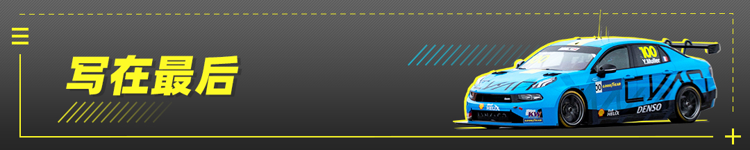 当然,领克03 TCR赛车与在售量产的领克03车系,都有着诸多共享技术:例如最重要的CMA基础模块架构,这是赛车与量产车的共同基石,目前领克大部分车型都出自于该架构。而TCR赛车的打造,则进一步说明了该架构不仅能满足日常使用场景,亦能满足赛事极端需求!谈及赛车,又怎么能少了空气动力学?TCR赛车对于风阻系数的要求绝对是非常严谨的,虽然赛事对空气动力学套件有着严格要求,但团队如何调节,如何进一步降低风阻系数,正是精湛技术的体现所在。而领克03 TCR赛车在受BoP限制之下仍能夺冠,说明领克团队在这方面有很强的技术实力。于是到了普通量产车上,像风刃式前保气帘、平整的底盘包覆、尾部扩散器、定风运动尾翼等,这些都会是与TCR赛车共享技术的体现之一。特别是对于领克旗下的运动性能系列、玩乐性高的车型,这些提升尤为重要。所以很多时候,所谓的外观套件不仅仅是起到装饰作用,也是该品牌在赛道累积下,能带来实际提升效果的套件。领克参加WTCR房车世界杯的意义,也在于把品牌技术放到赛道上试验,并在国际舞台上展现实力。而领克03 TCR赛车的夺冠,无疑是对蓝本车型领克03的认可。
