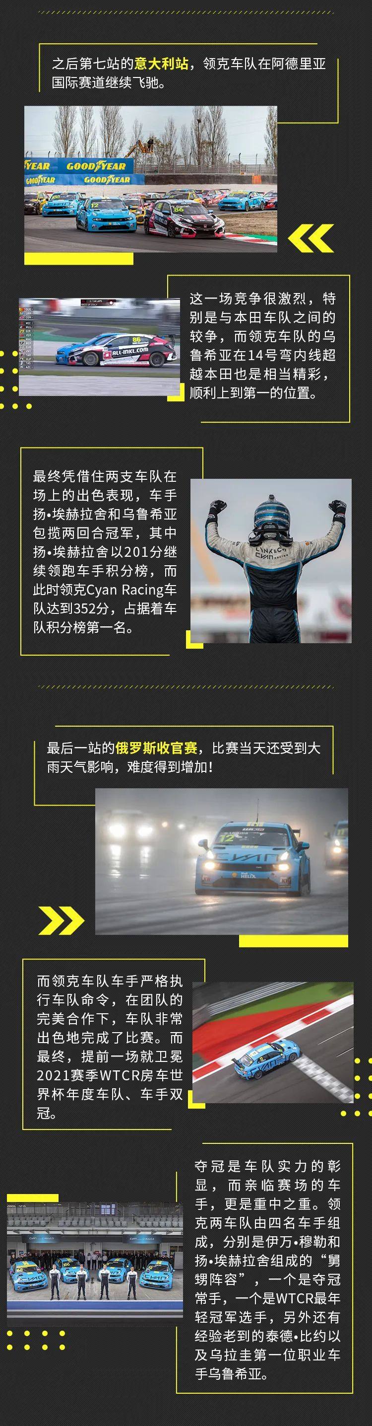 荣登KING OF WTCR宝座的,正是来自领克Cyan Racing车队的扬·埃赫拉舍(Yann Ehrlacher),他以个人223总积分卫冕年度车手总冠军,实至名归!当然更可喜可贺的是,领克车队以4冠5亚5季的好成绩,以及总分392斩获年度车队总冠军,实现2019-2021赛季三连冠!划重点:这不仅是领克车队的首个三连冠,更是WTCR历史上的首个三连冠!车手、车队再度实现双卫冕,让观众领略了领克03 TCR赛车以及背后团队技术的实力,而这一抹蓝,也让世界看到了中国速度!领克车队自2019年首次参加WTCR便夺冠,到2020赛季则收获车手、车队双冠,如今2021赛季再度卫冕双冠。每一赛季都是迎难而上,佳绩绝对来之不易。