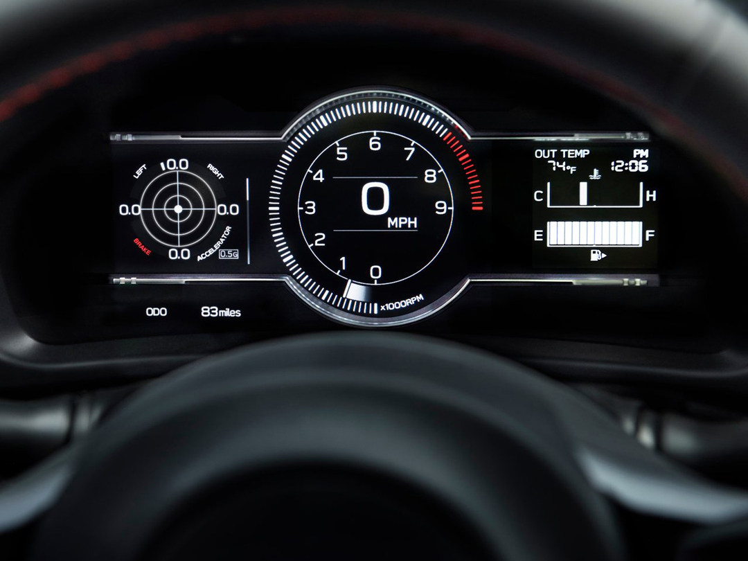 不过,斯巴鲁还是为驾驶员带来了不少好东西。首先是一个7英寸的液晶显示屏,该显示屏集成了车辆转速和时速显示,同时左侧还能自定义显示电压、水温、G值等信息,基本上可以不用加装额外的仪表,随时随地监控车辆的健康状态。