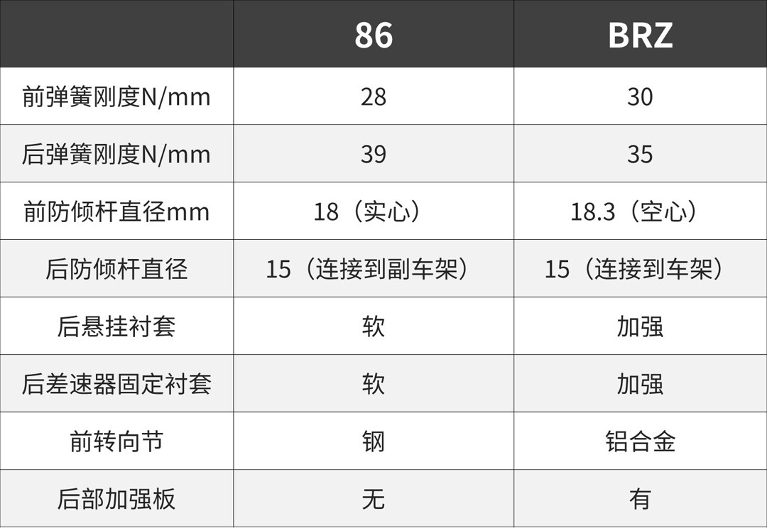 根据网上资料可以发现,86和BRZ在前后弹簧刚度、防倾杆致敬、衬套类型、转向节用料以及后部加强板都会一定的出入。