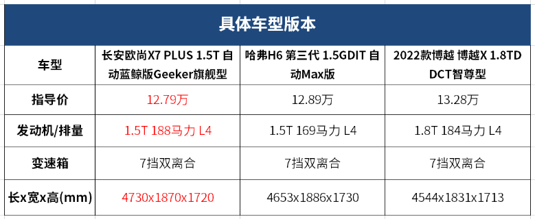今天就来做一个对比,看看长安欧尚X7PLUS、哈弗H6、吉利博越这三者之间,谁才是最正确的选择。没具体车型版本对比都是耍流氓,为了符合开篇13万购车预算,分别选取了下述车型版本。