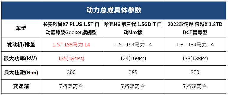 长安欧尚X7PLUS、哈弗H6都是搭载1.5T排量发动机,而吉利博越搭载1.8T排量发动机,不同的是,长安欧尚X7PLUS1.5T发动机为蓝鲸新一代NE1.5T高压直喷发动机,最大功率为138kW,最大扭矩为300N·m。参数甚比吉利博越的1.8T还要高。