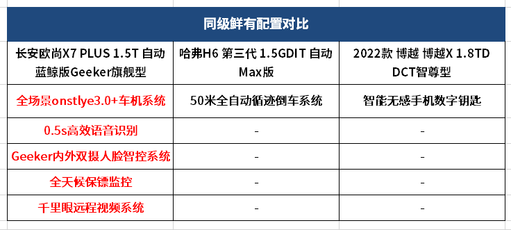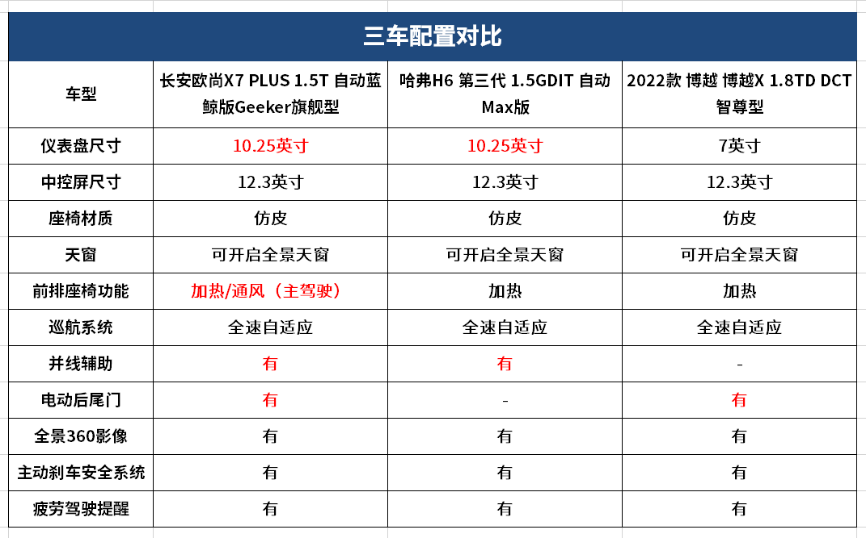配置属自主品牌的“取胜法宝”,毋庸置疑,选取并具体到车型版本的长安欧尚X7PLUS、哈弗H6、吉利博越都会以“满大杯”的属性出现。暂且不说你有我有的配置,就看同级鲜有的科技配置。