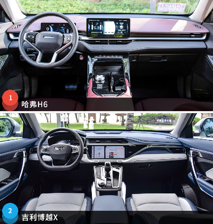 哈弗H6、吉利博越内饰的整体布局也较为符合当下主流审美,但是在越趋大屏、讲求科技感的时代,哈弗H6却换装上一块尺寸相对小液晶仪表盘,而另一边,吉利博越还是采用传统镶入式中控屏,在科技感层面要失分不少。