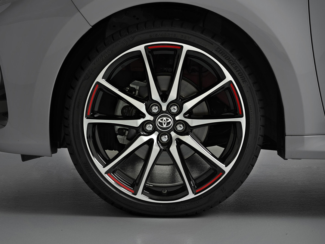 轮毂也更换成十辐样式,并带有红色装饰条,整体的样式类似于GR YARiS,不过GR YARiS上的是锻造的。