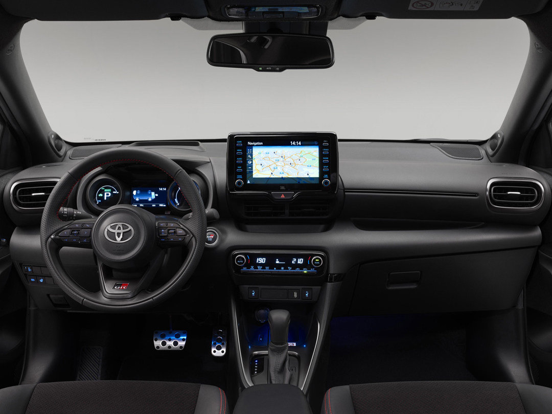 内饰方面选择红黑配色,与人体贴合的部分使用摩擦力较大的材料,而其他则是黑色皮革搭配红色缝线。同时在方向盘、头枕、仪表等地方增加GR标识,强化车辆与GR的关系。