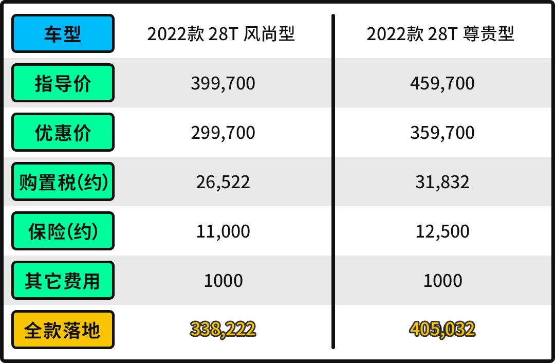 价格方面,目前2021款凯迪拉克CT6普遍优惠10万元左右,各别地区甚至更高,而2022款车型没有太多升级,可想而知,优惠基本会保持一致,以便提高市场竞争力。以推荐的车型配置为例,优惠后裸车价为29.97万元,购置税26,522元,商业保险+交强险11,000元,上牌费+车船使用费1000元,全款落地为33.82万元。如果是分期购车,以首付30%分期三年来算,首付金额为12.83万元,每月还款6264元。仅供参考,实际请以当地优惠为准。