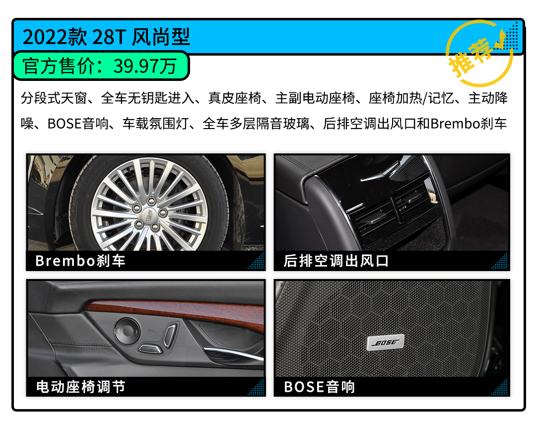 最后关于2022款凯迪拉克CT6的配置选择,买买君更推荐入门版的风尚型,就是图个性价比,且该有的配置一样不少,放到其他品牌上那就是高配,像标配了被动行人保护、分段式天窗、全车无钥匙进入、真皮座椅、带多项调节的主副电动座椅、座椅加热/记忆、手机CarPlay/CarLife、主动降噪、车联网、8扬声器BOSE音响、车载氛围灯、全车多层隔音玻璃、后排空调出风口以及Brembo刹车系统等配置。