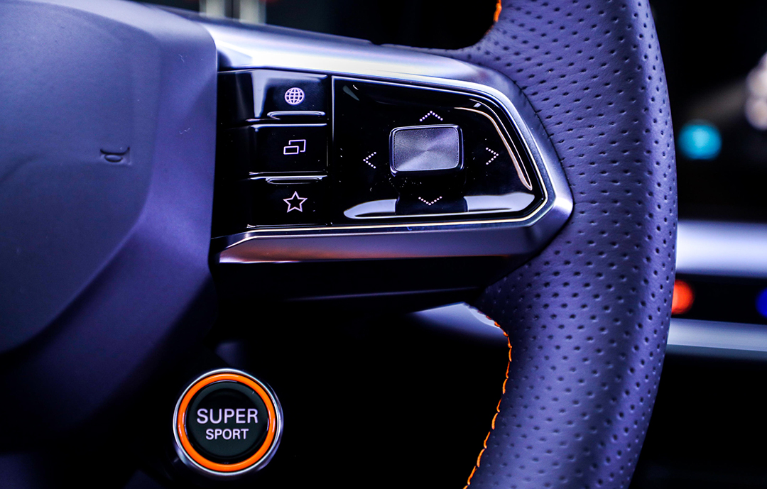 方向盘上多功能控制区的摇杆可以通过轻轻拨动调节音量、切换行车信息等,使用体验就如游戏手柄一般;结合平底式运动方向盘紧凑的尺寸和一流的握感,使用MG ONE的电竞赛车方向盘就如同打游戏般充满乐趣。