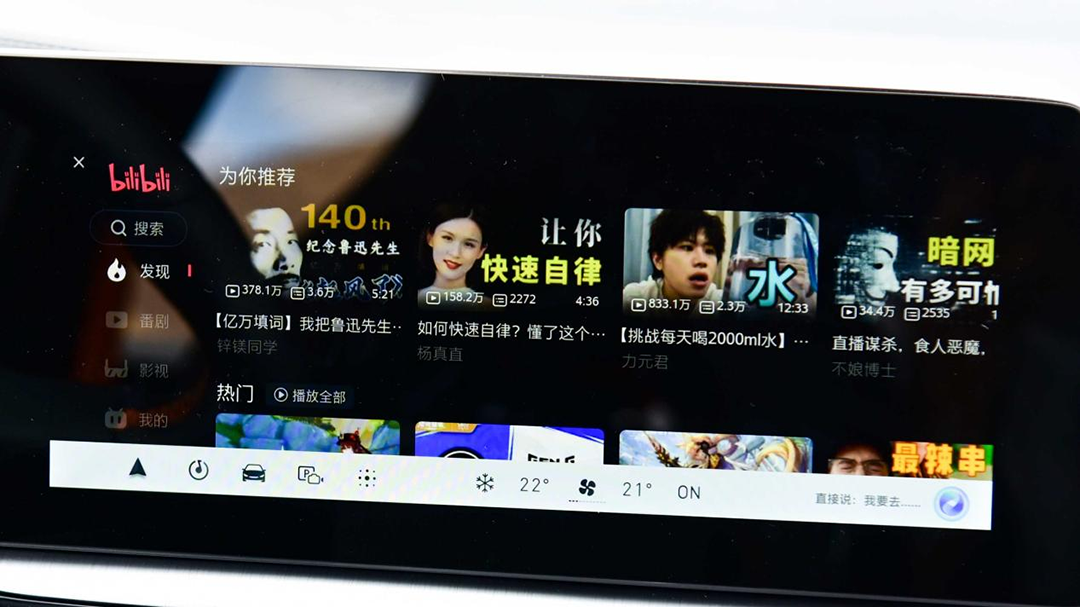 平时教授在停车等人的时候都喜欢掏出手机来刷一下B站,而在MG ONE车里,手机也不用掏了,直接就能在车机上看到B站的各种视频、电影,甚至还能用语音控制发弹幕、点赞。