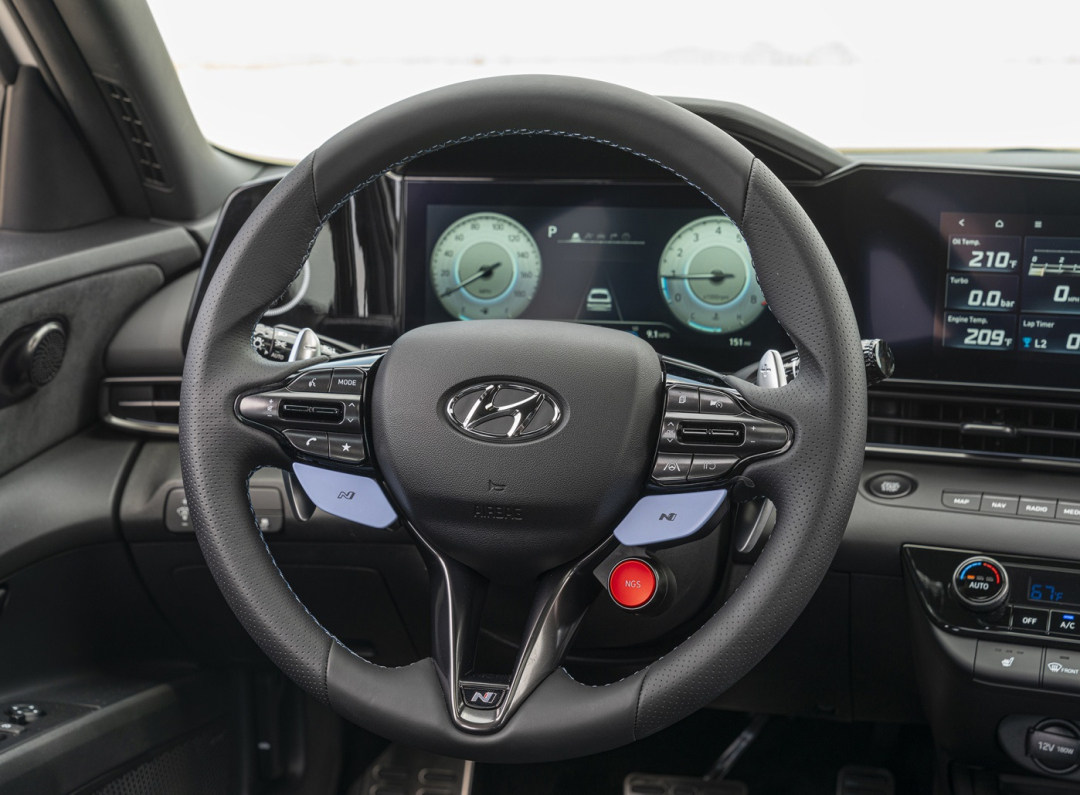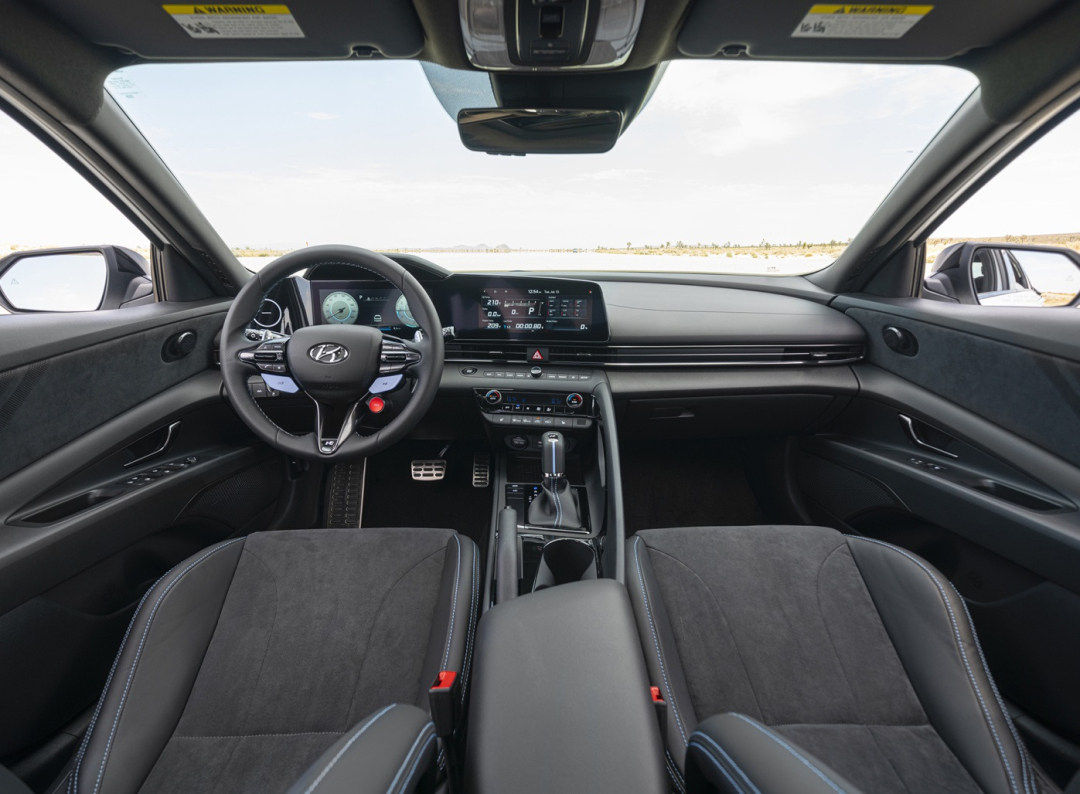 内饰方面,延续了普通版伊兰特简洁时尚的设计风格,双10.25英寸大屏也紧贴时下科技的内饰设计主流,偏向驾驶员一侧的中控台也体现了人性化的设计。当然新车在功能上和用料上还是有很大区别,比如配备了一体式运动座椅,并采用Alcantara材质进行包裹,头枕下方也有明显的“N”标识。