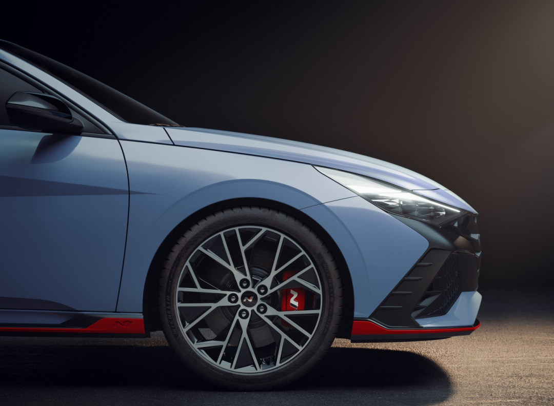 车身侧面,整体轮廓与普通伊兰特保持一致,依然是比较优雅时尚的人Z型腰线以及年轻人喜欢的溜背式车身造型。不同于之处在于这款19英寸运动多幅式轮毂,让整车显得更为低趴运动,不仅仅是好看,其所配备的轮胎为米其林PS4S,能有效提升干湿地抓地力和刹车性能,带来更出色的高速稳定过弯性能。