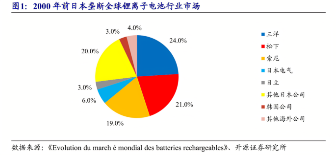 截至2000年,日本锂电池企业总销售额占据全球93%的份额,可以说是“垄断”了。