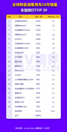 【2021年12月9日】据权威市场研究机构EV Sales最新数据显示,宏光MINIEV以10月39128台的批发量再度登顶全球新能源汽车销量第一,这也是该车今年第五次摘得全球销量桂冠,晋升“五冠王”。此前,据乘联会数据显示,10月宏光MINIEV还以47834台的零售成绩,斩获中国轿车榜销冠;11月,宏光MINIEV又凭借45576台销量,实现连续15个月霸榜中国新能源市场销冠,目前整体销量已突破50万,“中国新能源领导者”实至名归。