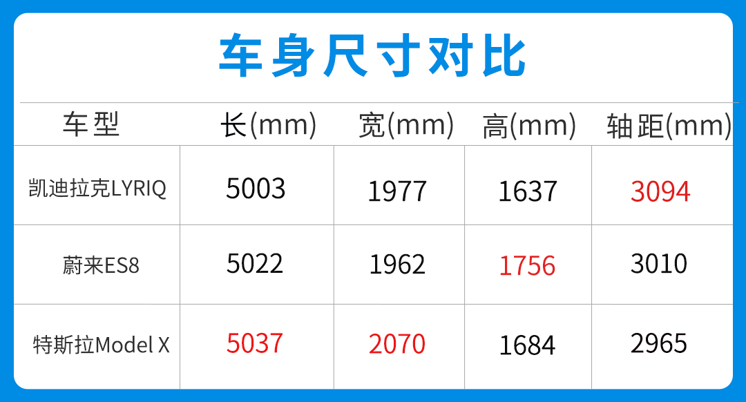 尺寸方面,LYRIQ国产版长宽高分别为5003/1977/1637mm,轴距为3094mm,与同为中大型SUV定位的蔚来ES8、特斯拉Model X相近。本身纯电平台车型的空间利用率非常高,加上如此大的车身尺寸,使得LYRIQ拥有出色的乘坐空间和装载空间。