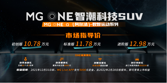 2021年12月31日前,用户在MG Live APP支付3000元定金,且2022年2月28日前提车,即可享有ONE福来潮礼——四大上市权益:一是创智互联礼,终身免费基础流量;二是创变置换礼,置换补贴至高6000元;三是创享金融礼,至高可享60个月0利率;四是创行特权礼,按照订单顺序确保优先交车权。