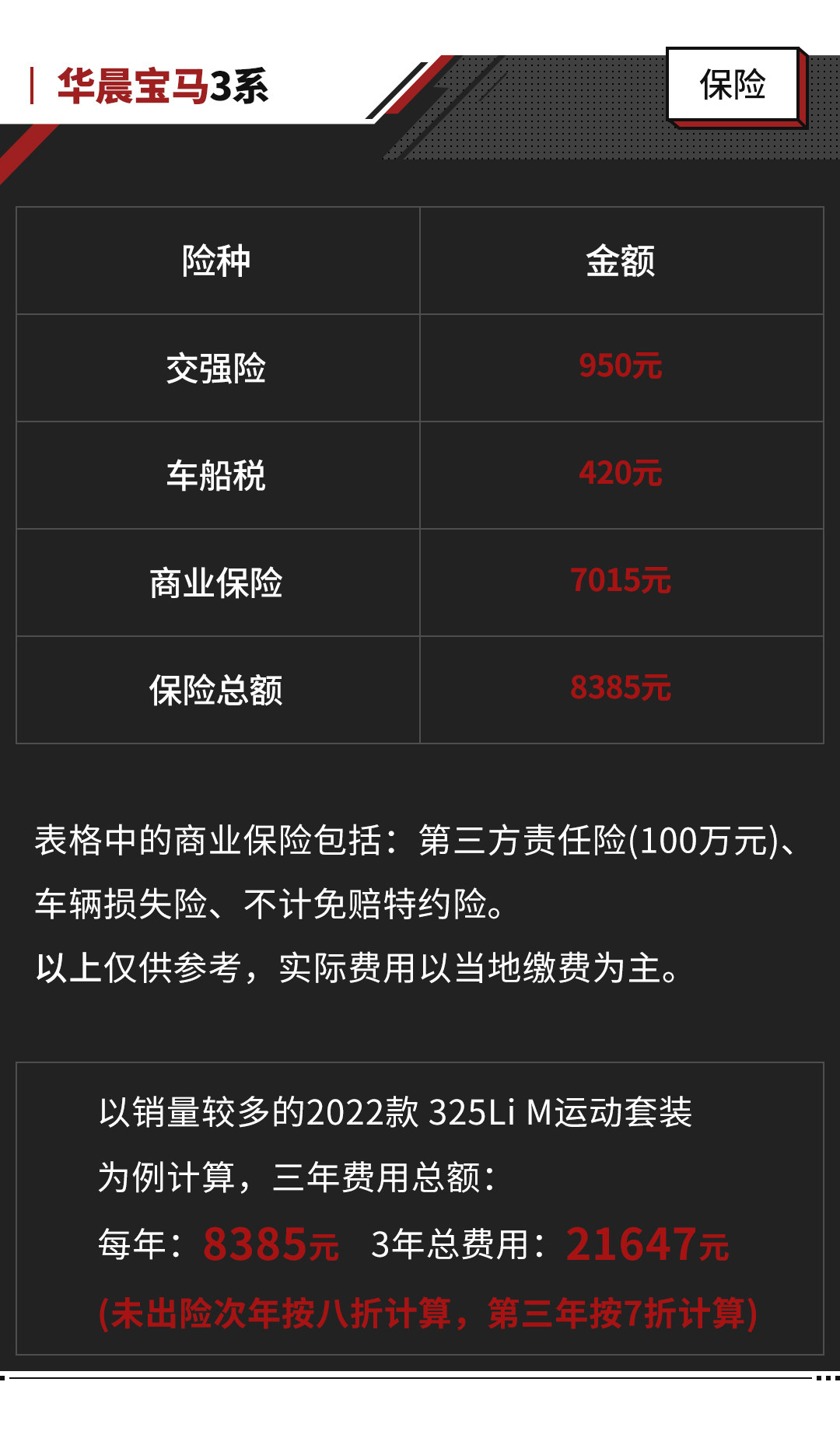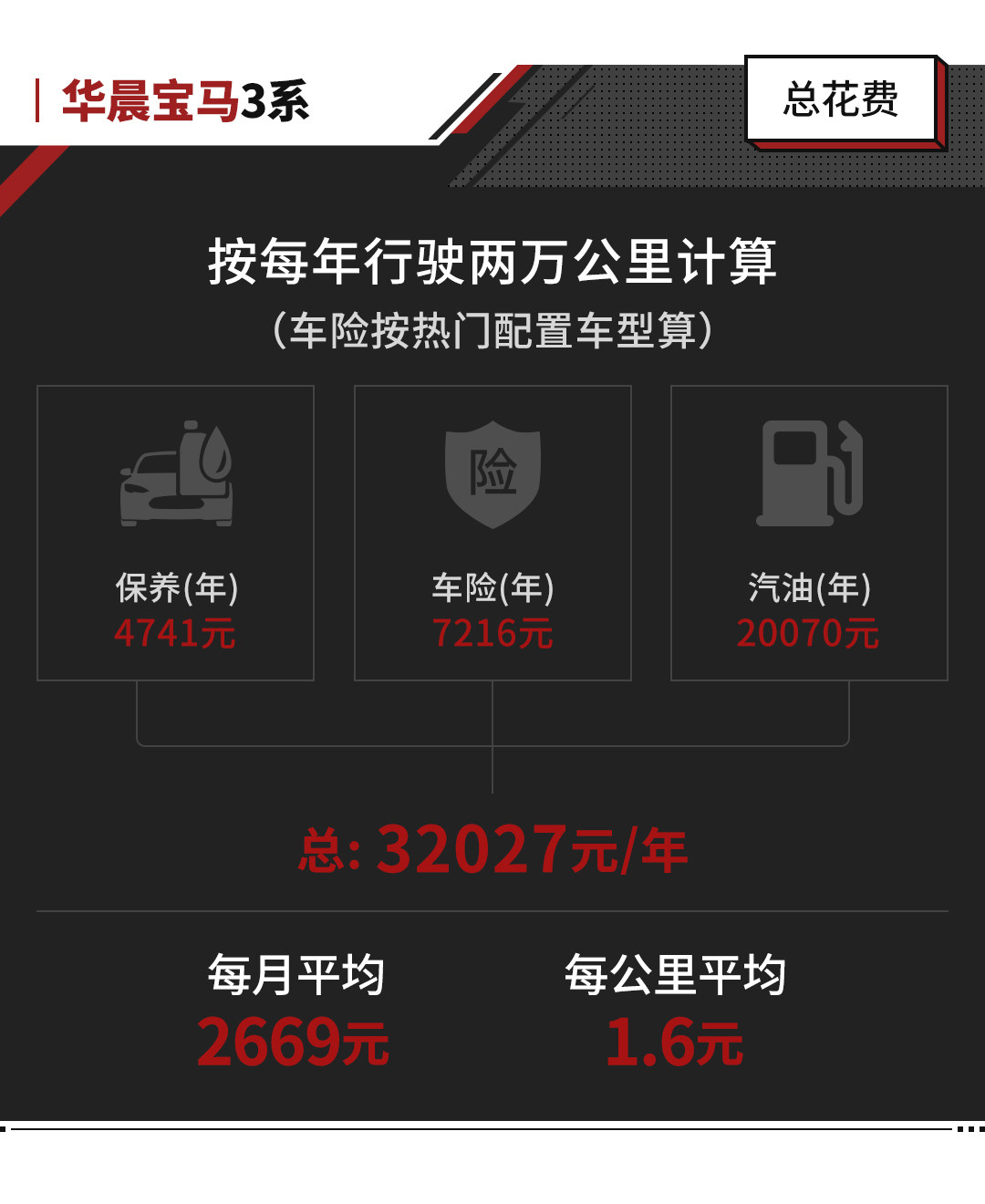 结合保养、车险、油费这三大后期支出,假如按照每年行驶两万公里路程计算的话,宝马3系的总支出为32027元,平均每公里达到了1.6元,这主要是受到较高的保养成本及保险费用支出影响。