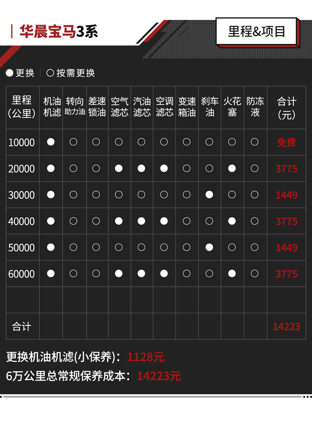 在具体保养成本环节,宝马3系的6万公里保养总支出达到了14223元,几乎是普通合资中型车的两倍。在高费用的背后,主要还是由于其较高的配件价格以及复杂的保养要求。通过以上表格可以看到,宝马3系每隔两万公里,就需要对各种滤芯以及火花塞进行全面更换,加上机油机滤等耗材,费用达到了3775元,这是同级别中较为罕见的。